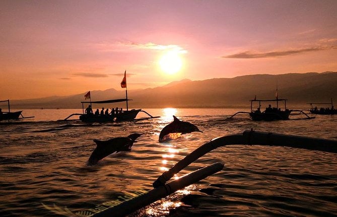 Start your day with a magical sunrise on the calm waters of Lovina, where wild dolphins swim and jump freely beside your boat.